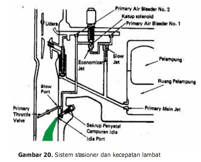 Pada saat mesin berputar stasioner, bahan bakar mengalir dari ruang pelampung melalui primary main jet, kemudian ke slow jet, economizer jet, dan akhirnya ke ruang bakar melalui idle port. Kemudian pada saat pedal gas ditekan sedikit, maka katup gas akan membuka lebih lebar sehingga aliran bahan bakar dari ruang pelampung tersebut masuk ke ruang bakar selain melalui idle port juga melalui slow port.